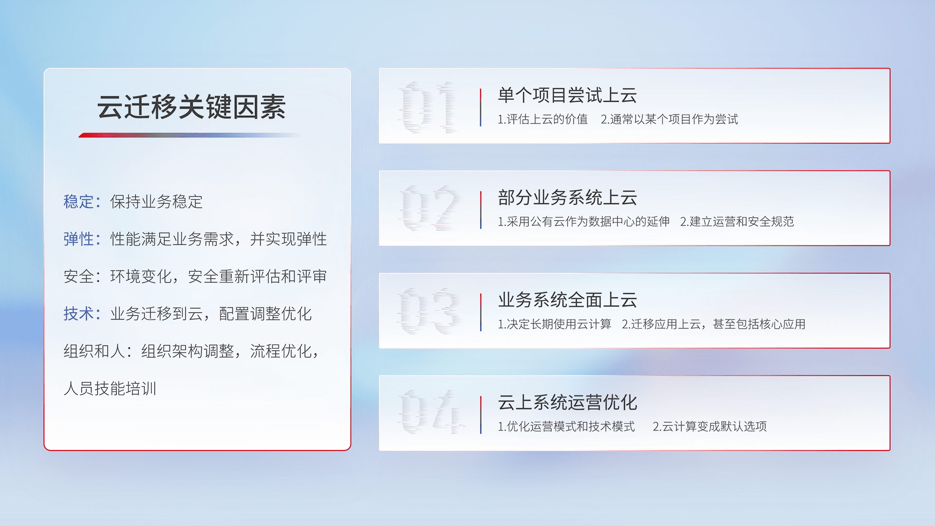 结合实际业务,,,从规划设计、、、、云平台选型、、、、云原生改造、、、、数据迁移、、、、集成交付,,迁移全过程为客户识别最佳上云路径,,,做好风险识别管理,,,设计网络架构、、、身份权限、、安全审计合规、、操作审计、、日志审计、、、监控告警策略、、、多站点容灾设计等,,,,对云上基础设施进行整体规划,,,提升IT治理水平,,,以满足弹性、、、高可用、、、高性能的需求。。