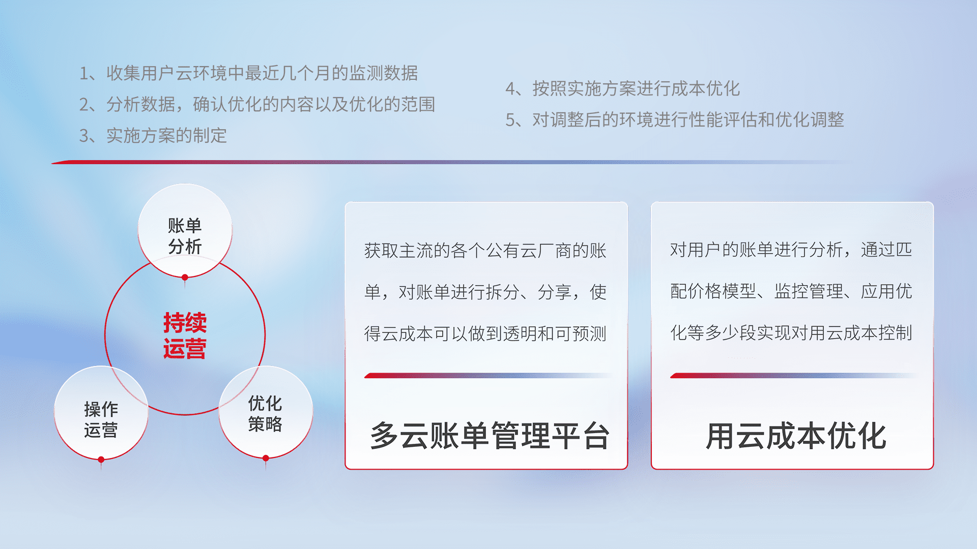 通过多云纳管,,,以统一的资源数据模型把客户的云资源进行抽象和封装,,进而实现对多云资源的统一操作,,,保障云资源管理的可靠性、、稳定性与可用性。。量身定制化运维内容,,,配置、、、、开发运维、、补丁管理、、备份、、监控、、、认证和访问管理、、、、审计和日常巡检等,,,,保障在用云过程中的可靠度,,,稳定度以及高可用率。。。